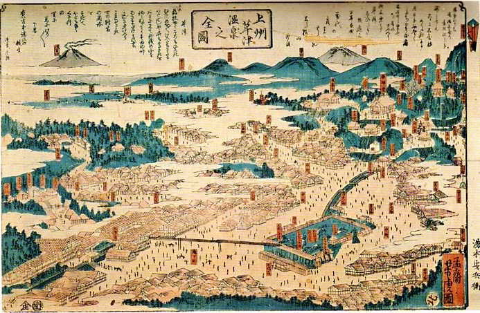 当時の草津には『御座(ござ)の湯』『熱(ねつ)の湯』『綿(わた)の湯』『かっけの湯』『滝の湯』『鷲(わし)の湯』『地蔵(じぞう)の湯』『金毘羅(こんぴら)の滝の湯』と八つの湯小屋(正確には七つ、かっけの湯は露天だった)があり、内湯があったのは湯本三家といわれる湯本安兵衛、湯本平兵衛(へえべえ)、湯本角右衛門(かくえもん)の三つの宿屋だけだった。これらの三家は江戸時代の初期まで、真田家の家臣として草津を支配していた湯本氏の流れであった。広小路に隣接した一等地に宿屋を持ち、湯池から樋(とい)でお湯を引いて内湯を作っている。安兵衛では『不老の滝』と呼ばれる内湯があった。